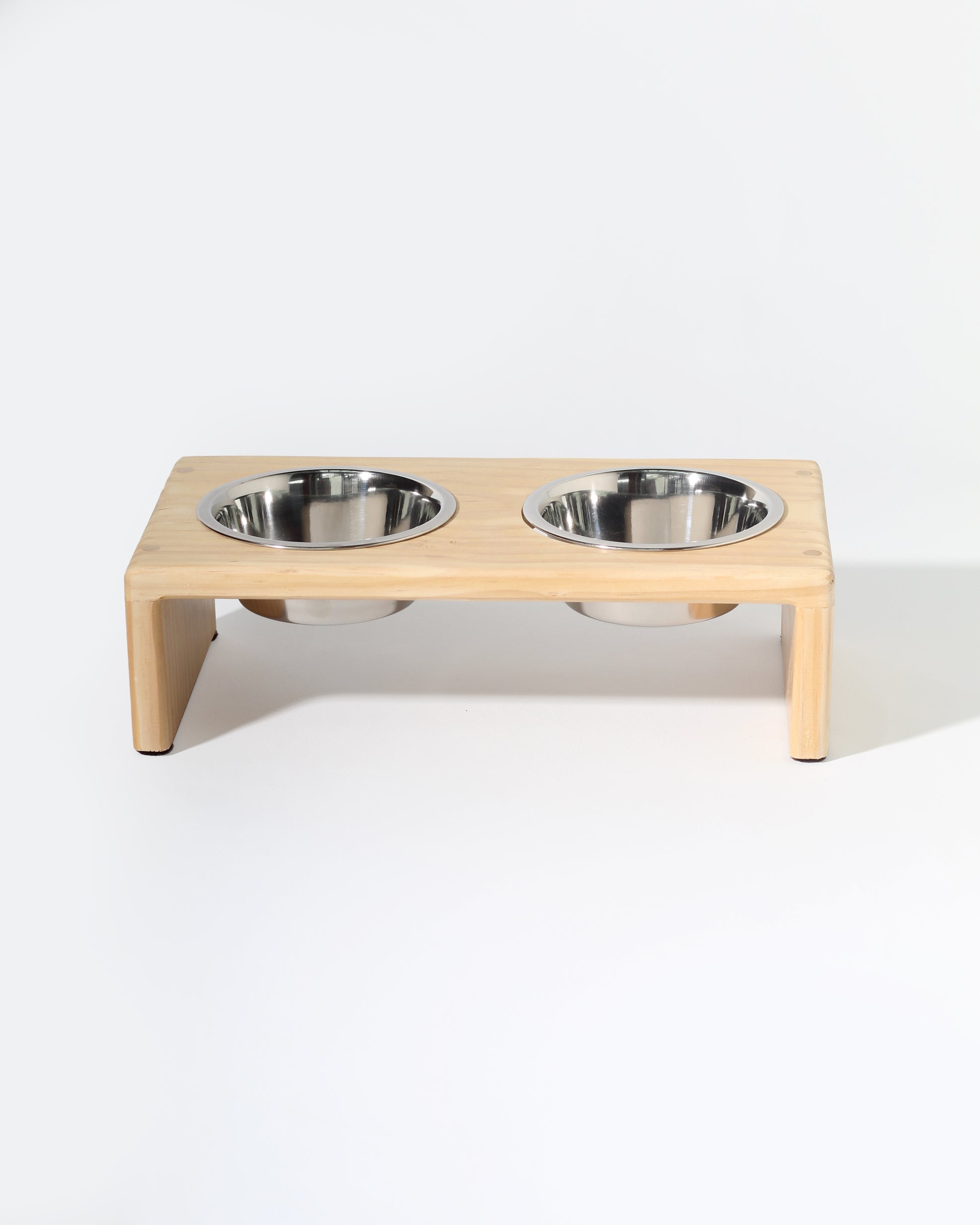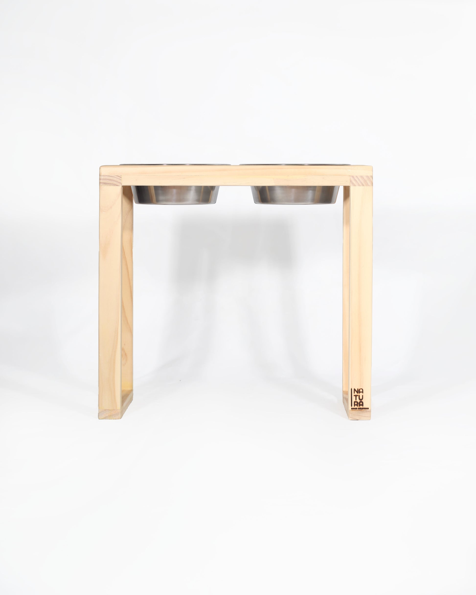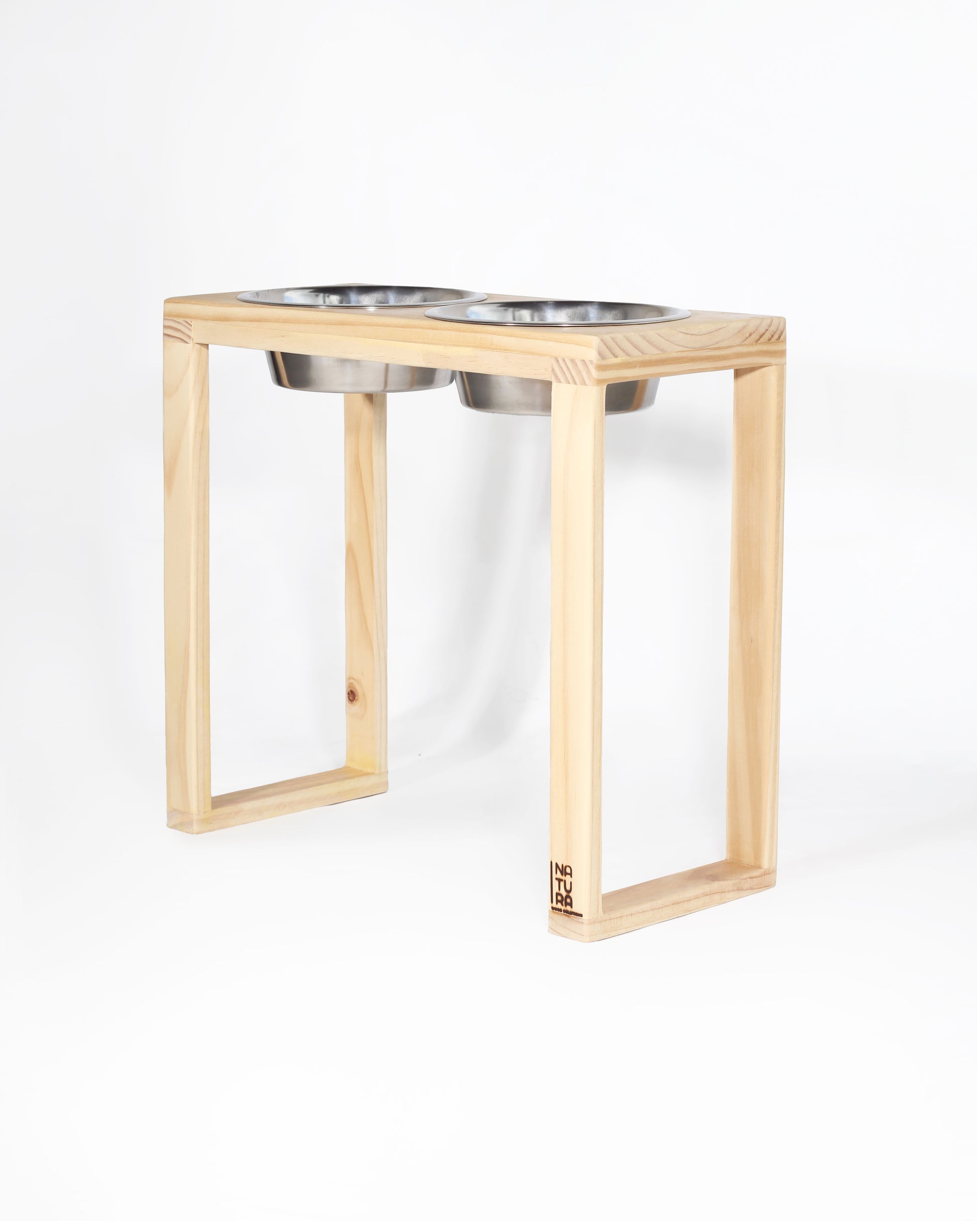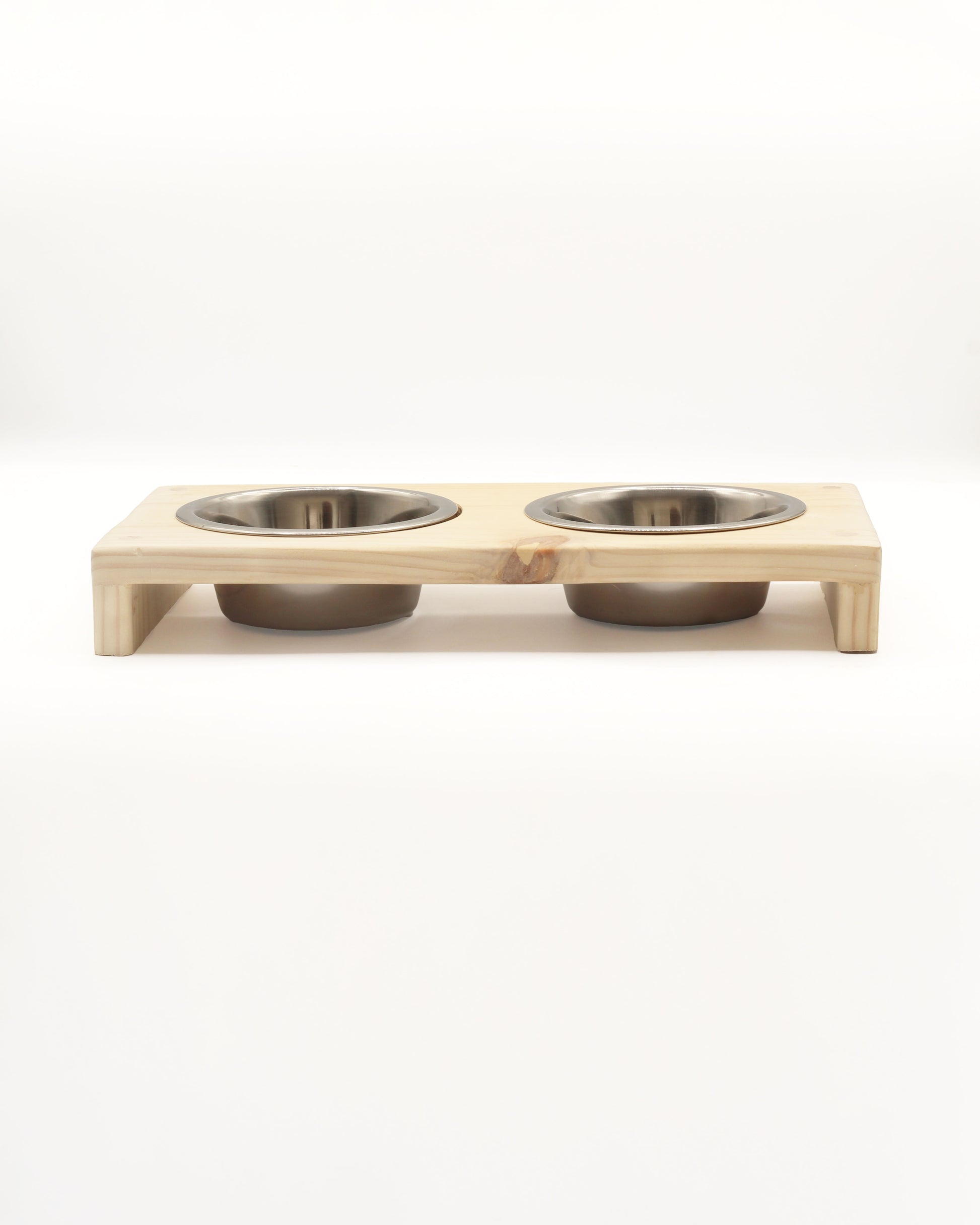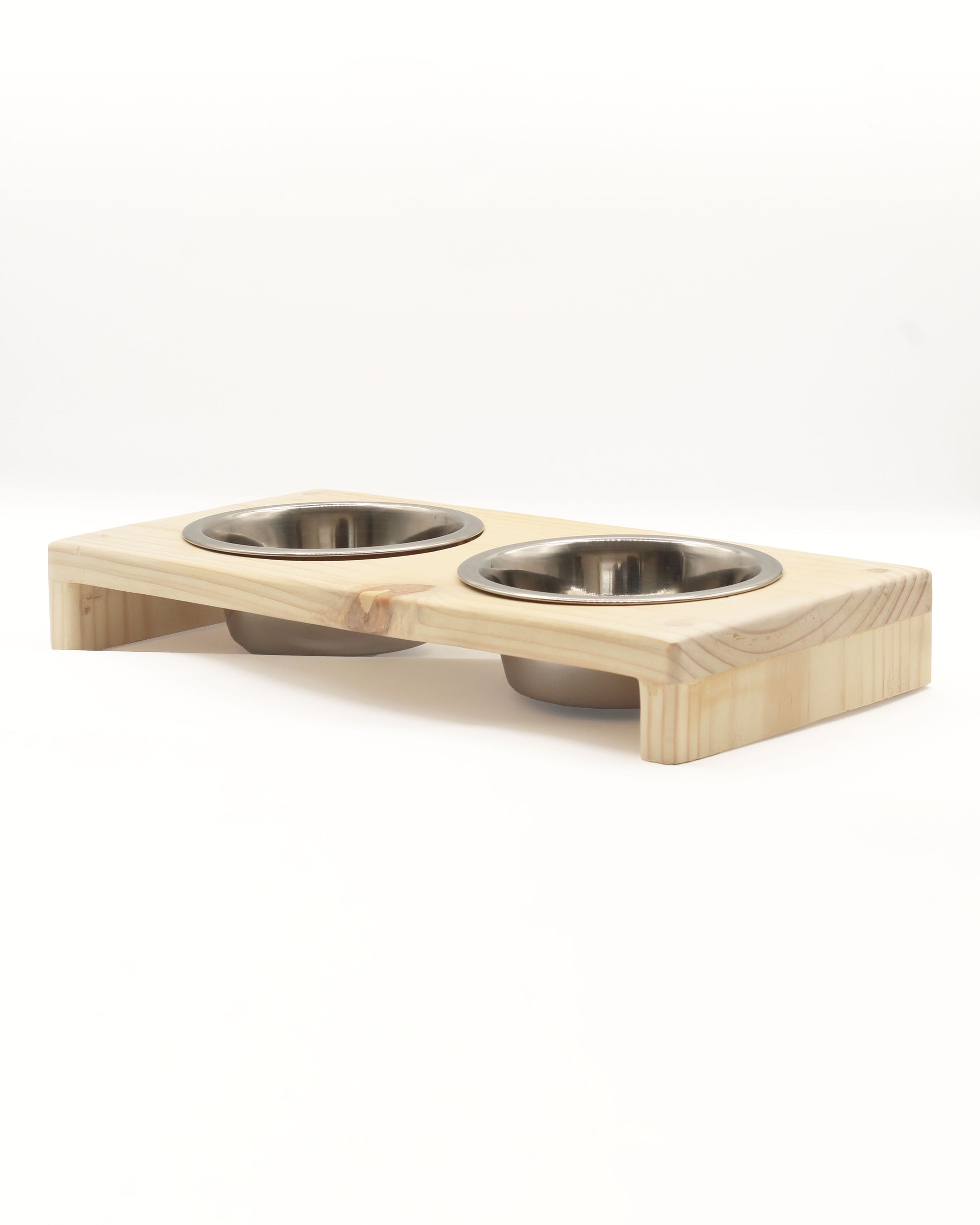 Este comedero doble fue el inicio de todo y sigue siendo el favorito por su diseño funcional y estético. Está hecho con una base de madera barnizada y cuenta con dos bowls de acero inoxidable, ideales para mantener el agua y la comida en un solo lugar.